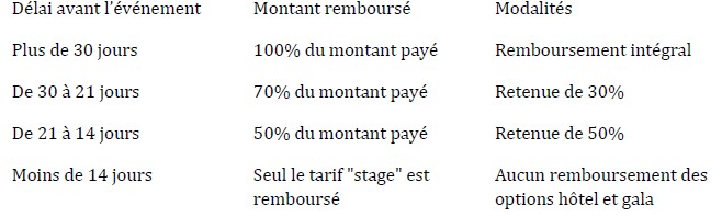 Si l’HEMAC devait être annulé par l’organisation, toutes les sommes versées seraient remboursées en totalité, y compris les options. Toutefois, les frais de transport ou de visa personnels ne pourront pas être couverts.
